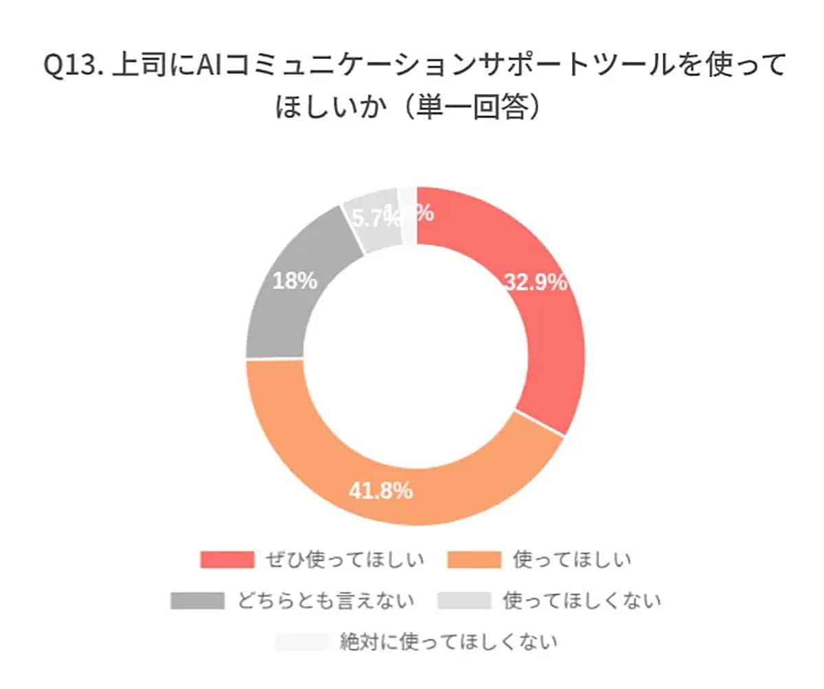 株式会社ペンマークと株式会社アルバトロスの調査によると、Z世代は上司からのコミュニケーションに対して不満を抱えており、全体の74.7%が「上司がAIによる、やる気を引き出す言葉遣いの提案機能を使う」ことを期待しています。これは、Z世代が曖昧な表現や一方的な指示に不信感を抱きやすい価値観を持っているため、AIが世代を問わず適切な言葉を選んでくれることに期待していると考えられます。Z世代は、効率や生産性だけでなく、自分の気持ちやモチベーションに配慮した伝え方を求めています。<出典>やる気をなくす上司の言葉? Z世代の本音は「AIに選んでもらった方がマシ」(スマホライフPLUS)