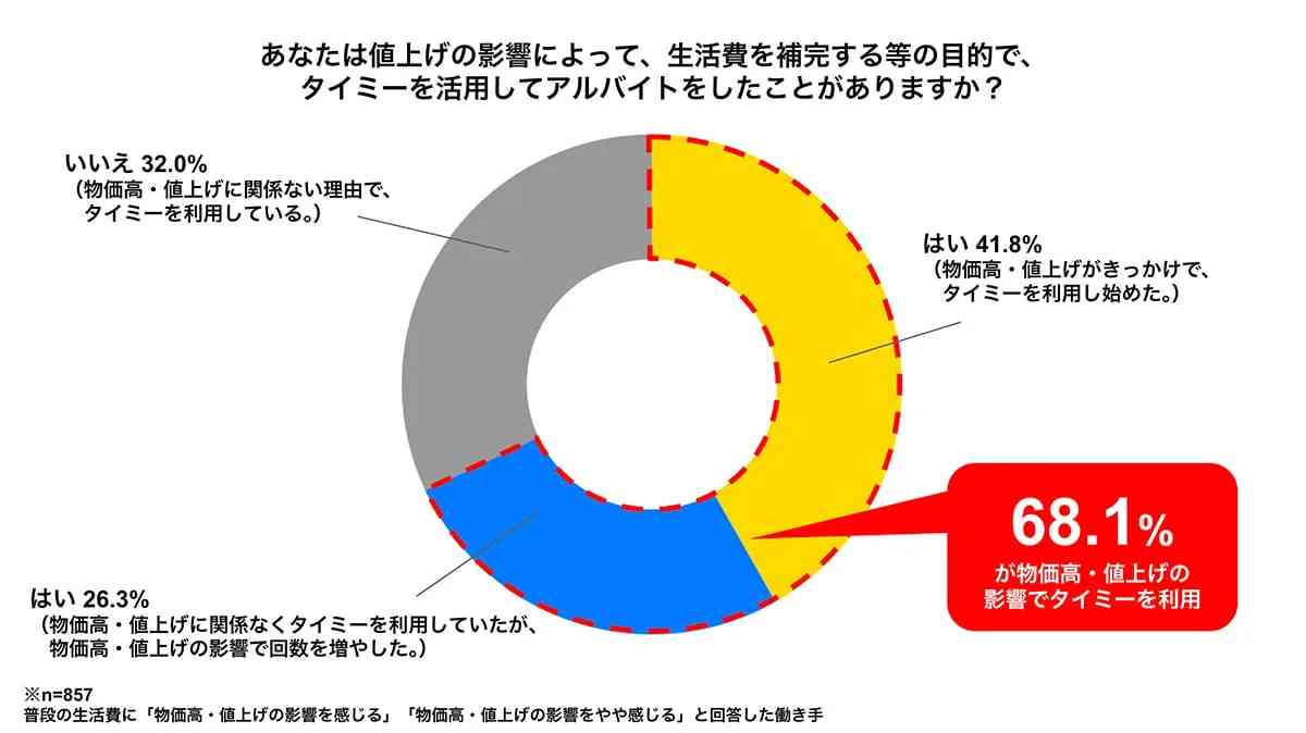 株式会社タイミーによる調査によると、「物価高・値上げ」の影響を感じている人は97.5%にも達しており、約7割が生活費の補填として「スキマバイト」を活用していることが明らかになりました。スキマバイトを選ぶ理由としては、「面接や履歴書が必要な求人だと仕事が決まりづらく負担に感じていたから」「働き方の選択肢を増やしたかったから」「やってみたい・挑戦してみたい仕事があったから」といった回答が寄せられています。<出典>物価高の影響を感じる人97.5%! 約7割が「スキマバイト」で生活費を補う現実(スマホライフPLUS)