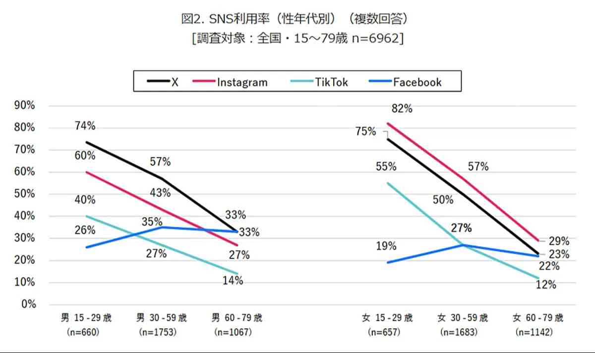 モバイル社会研究所による調査によると、主要SNS(X、Instagram、TikTok、Facebook)の利用率は年代によって明確な差が浮き彫りになっています。X、Instagram、TikTokは10〜20代の利用率が最も高いのに対し、Facebookは10〜20代の利用率が最低水準となっています。一方で、Facebookは比較的年齢層が高くても利用者が多いのが特徴です。実際に、60代以上の男性ではFacebookの利用率がXと同水準の33%に達しており、中高年層のビジネスやコミュニティに根付いた存在となっています。特にFacebookは「知人の状況把握」が突出しており、新しい情報発信の場というより、既存ネットワークを維持するためのツールとして定着しているようです。<出典>世代・性別で異なるSNS利用動向 高齢層はFacebookで知人の状況把握が突出(スマホライフPLUS)