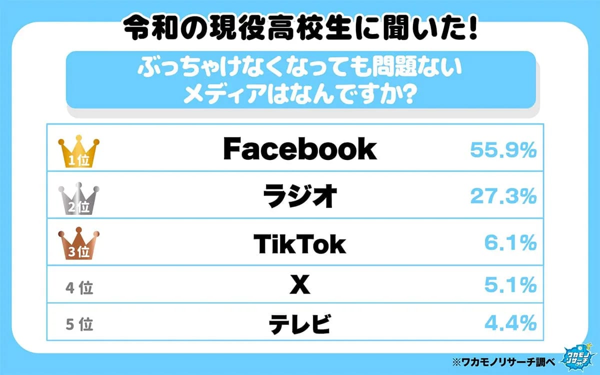 ワカモノリサーチによる調査によると、全国の現役高校生を対象に実施された「ぶっちゃけ、なくなっても問題ないメディア」に関する意識調査で、Facebookが55.9%で1位という結果になりました。Facebookが必要とされない理由としては、「使ったことがない」「インスタがあるから同じ機能はいらない」などが挙げられています。さらに「おじさんしか使ってない」「古い!古すぎる!」といった声も多く、おじさん向けメディアという印象が強く根付いていることが分かっています。また、Facebookが本名で登録するSNSであるため、「本名フルネームだし怖い」「身元がバレそう」など、個人情報特定のリスクを懸念し、利用を控える高校生もいるようです。?<出典>高校生が選ぶ「なくても困らないメディア」1位はFacebook “おじさん向け”の印象が強すぎた(スマホライフPLUS)