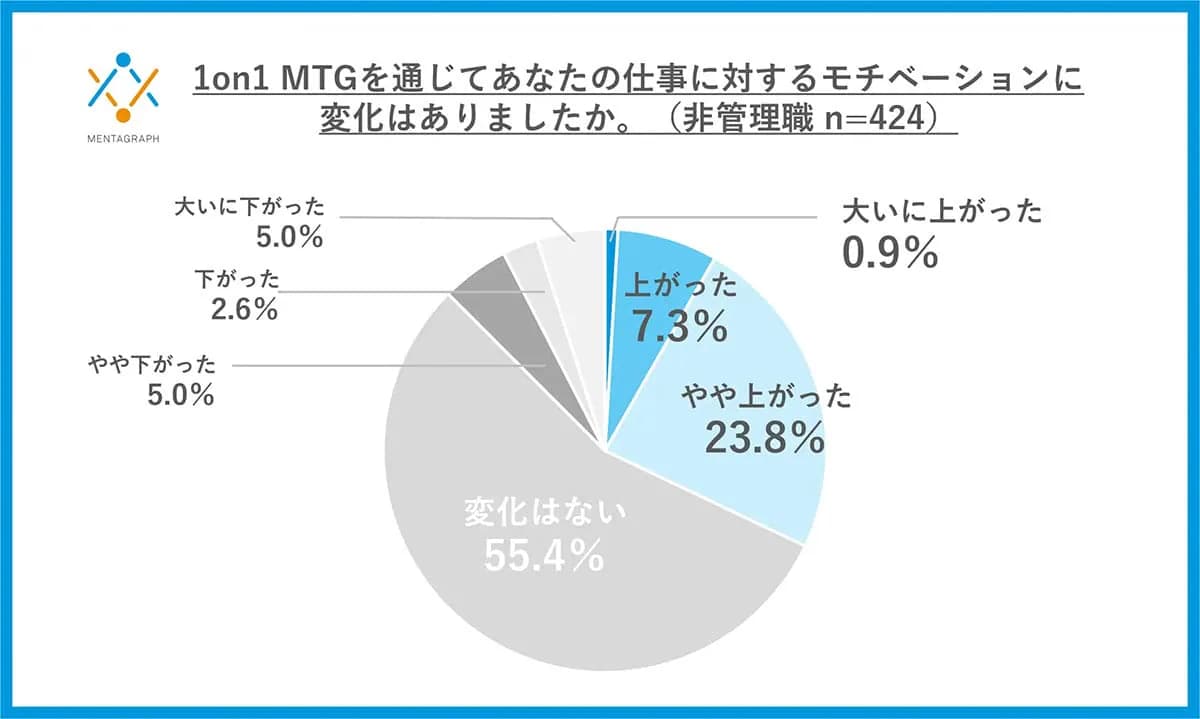 MENTAGRAPH株式会社による調査によると、1on1MTGの実態として「毎回似たような内容の繰り返しになっている」(51.9%)が最多となりました。非管理職の部下にモチベーションの変化を尋ねたところ、「上がった」と回答したのは約3割にとどまり、約7割が「変化はない」または逆に「下がった」と回答しています。一方で、上司側は43.7%が「ある程度手応えを感じている」と回答しており、上司と部下の間で満足度にギャップが生まれています。これは、定期的に実施すること自体が目的化し、本質的な対話に至っていない可能性を示唆しています。<出典>「もう形式だけ」?1on1MTGの実施で約7割が「モチベ上がらない」 上司と部下に温度差(スマホライフPLUS)