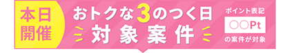 ・エントリーは不要です。 ・通常ポイントと「3のつく日」特別ボーナスは別々につきます。先に通常ポイントがポイント通帳に加算され、後日、3%分の特別ボーナスが加算されます。 ・虚偽、不正、いたずらなどが発覚した場合やポイント獲得が無効となった場合はボーナス対象外となります。 ・「予定明細」が付かない案件は対象外となりますのでご注意ください。 ・案件詳細ページにて「★予定Pt」と記載がない案件は予定明細が付きません。 ・「★予定Pt」表記がなくても即付与の案件は対象となります。 |