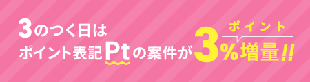 毎月3のつく日、3日・13日・23日・30日・31日は、ポイント表記が「〇〇〇Pt」の案件がのポイント3%増量されます。対象案件を利用すると、案件利用で獲得した通常ポイントに加え、その3%分のボーナスポイントを後日付与いたします!
