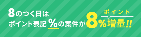 | キャンペーン内容 | 毎月8のつく日に対象案件を利用すると、通常の獲得ポイントの8%分が特別ボーナスとして後日付与されます。 |